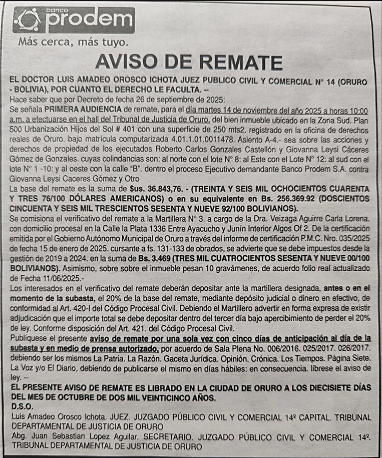 Ubicado en la Zona Sud, Plan 500 Urbanización Hijos del Sol # 401 con una superficie de 250 mts2, registrado en la oficina de derechos reales de Oruro, bajo matricula computarizada 4.01.1.01.0011478, Asiento A-4. sea sobre las acciones y derechos de propiedad de los ejecutados Roberto Carlos Gonzales Castellón y Giovanna Leysi Cáceres Gómez de Gonzales |