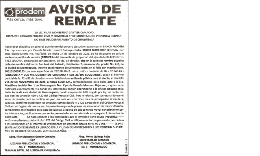 Oficina de Martillera Judicial N° 15, Abg. Vania Mónica Zeballos Rojas, ubicado en la Av. San Martin N° 453 Of N° 22 de la ciudad de Cochabamba. PROCESO EJECUTIVO BANCO PRODEM S.A. contra JOSE CARLOS INTURIAS FLORES Y OTRA NUREJ: 30298786