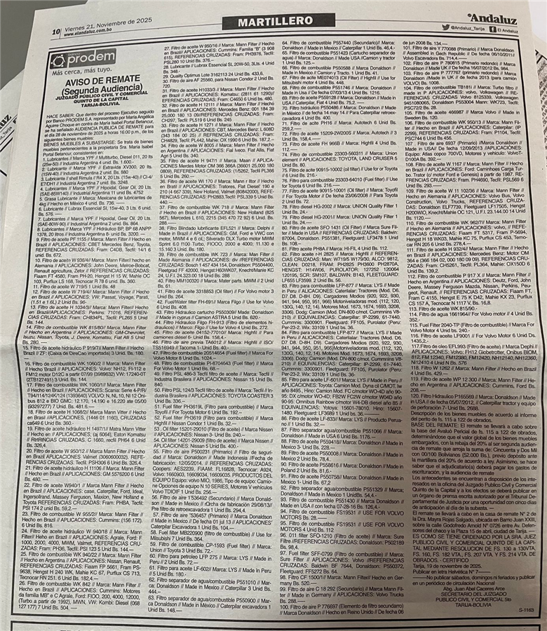 Bienes muebles consistentes en mercaderia de lubricantes de vehículo y mercadaria de filtros de aire y otros, de acuerdo al detalle del aviso de remate. |