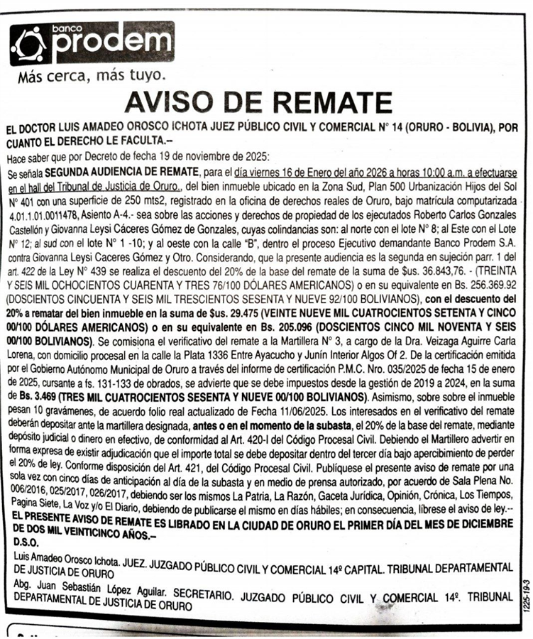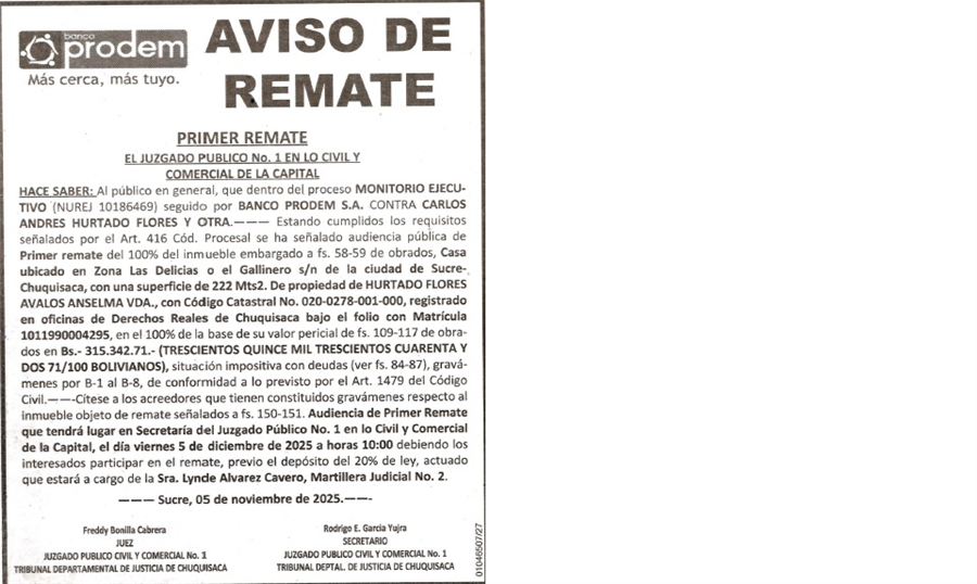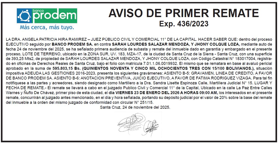 EI remate se llevará a cabo en el juzgado Publico Civil y Comercial 110 de la Capital, Ubicado en la calle La Paz Entre Calles Warnes y Ñuflo De Chávez, primer piso de esta ciudad de Santa cruz de la Sierra