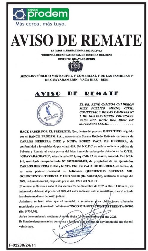 El acto de remate será llevado adelante en la Secretaria del Juzgado Publico Civil Comercial y de las Familias N° 2 de Guayaramerin, ubicado en la es en la calle Oruro esquina Nicolás Suárez, en la zona central, el acto de remate será llevado adelante a las 14:30 por la martillera judicial N° 1 de Guayaramerin, Dra. Dulmar Pinheiro Ortiz.