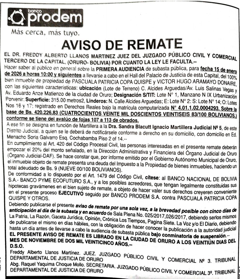 Ubicación (Lote de Terreno) C. Alcides Arguedas/Av. Luis Salinas Vegas y Av. Eduardo Anze Matienzo de la ciudad de Oruro; Designación S/TIT: Lote N° 1, Manzano N IX Urbanización Porvenir: Superficie: 315.00 metros2, Linderos: N. Calle Alcides Arguedas; E: Lote N° 2: S: Lote N° 14; O: Lotes Nos 16 y 17: registrado en Derechos Reales bajo la matricula computarizada Nº 4.01.1.02.0004293 |