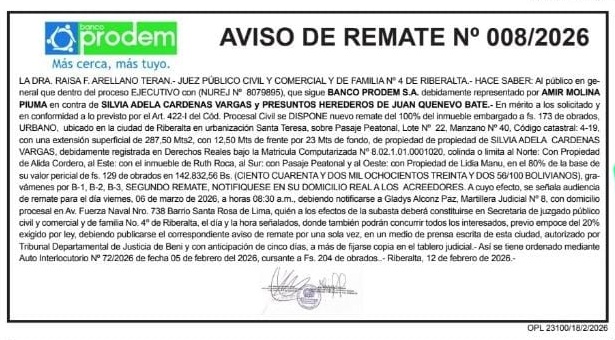 Secretaria del Juzgado Publico Civil, Comercial y de las Familias N° 4 de Riberalta, ubicado en la Casa Judicial de Riberalta, ubicado sobre la Av. Heiniken y c/ Placido Martínez N° 234, el acto de remate sera llevado adelante por la Martillera Judicial N° 8 Dra Gladys Alconz Paz, a las 08:30 a.m.