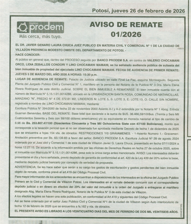 Aviso de Remate Potosí |