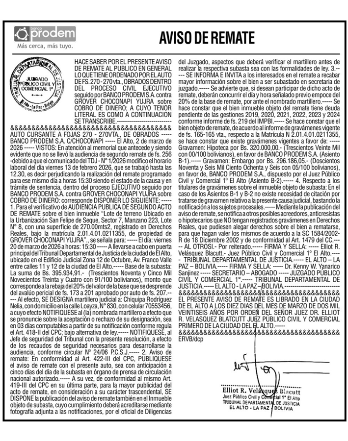 Aviso de Remate Chuquisaca |