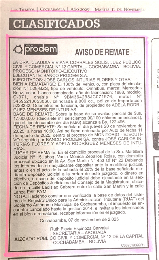 Oficina de Martillera Judicial N° 15, Abg. Vania Mónica Zeballos Rojas, ubicado en la Av. San Martin N° 453 Of N° 22 de la ciudad de Cochabamba. PROCESO EJECUTIVO BANCO PRODEM S.A. contra JOSE CARLOS INTURIAS FLORES Y OTRA NUREJ: 30298786