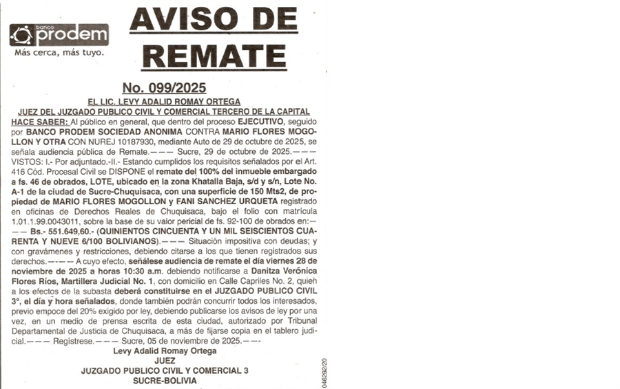 Aviso de Remate Chuquisaca |