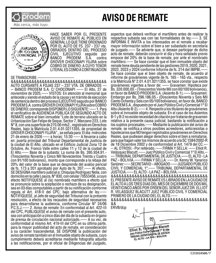 Aviso de Remate La Paz |