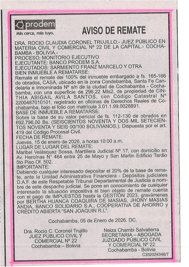 Oficina de la Martillera Judicial N° 17 Dra. Maribel Velásquez Sossa, Martillera Judicial ubicado en Av. Heroínas N° 464 entre 25 de Mayo y San Martin Edificio Tardio 5to Piso Of. 502. PROCESO EJECUTIVO: BANCO PRODEM S.A. contra FRANZ MARCELO SARMIENTO Y OTROS