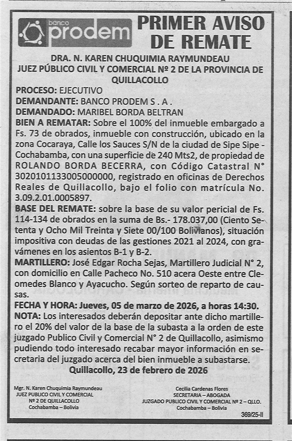 Oficina del Martillero Judicial N° 2 Abg. José Edgar Rocha Sejas, ubicado en calle Pacheco No. 510 acera Oeste entre Cleomedes Blanco y Ayacucho de la localidad de Quillacollo. PROCESO EJECUTIVO: BANCO PRODEM S.A. contra MARIBEL BORDA BELTRAN Y OTROS.