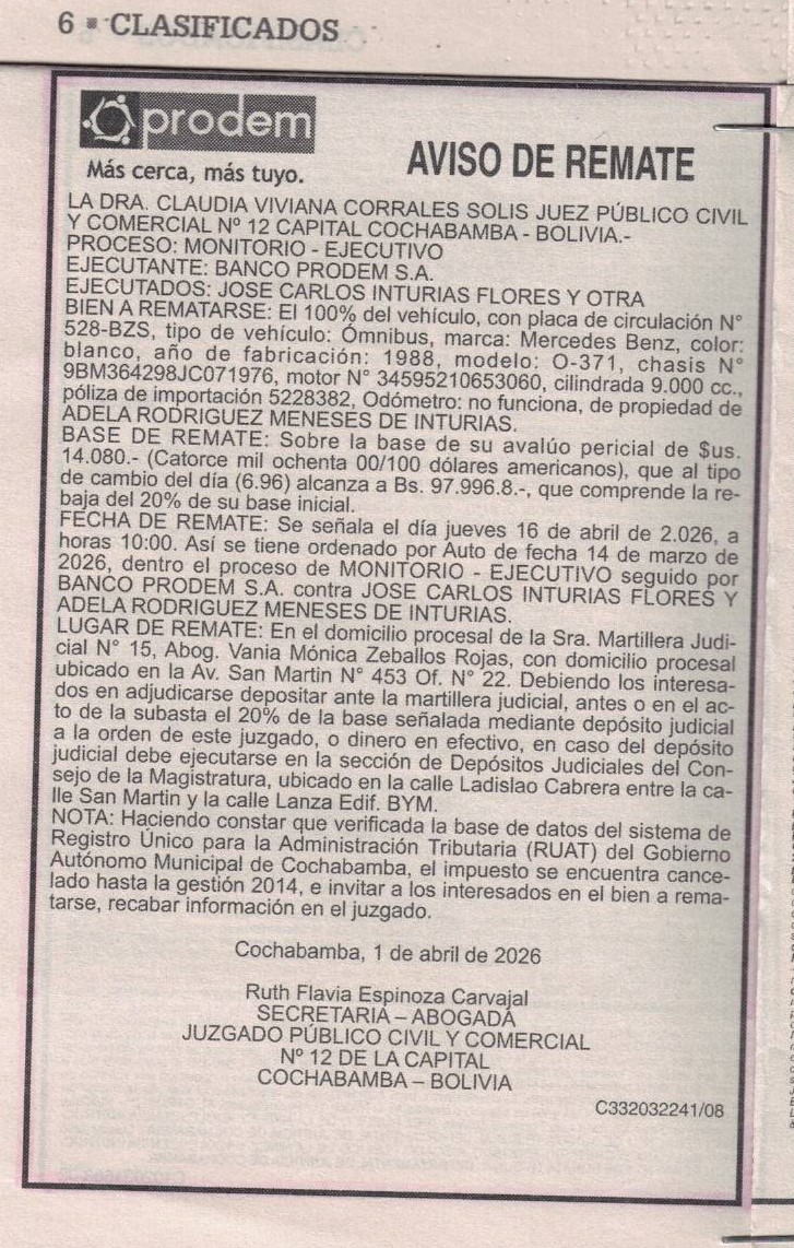 Aviso de Remate Cochabamba |